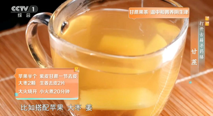 1.甘蔗苹果茶——温中庸胃、养阴生津食材:苹果半个、紫皮甘蔗一节、大枣2颗、生姜去皮2片。